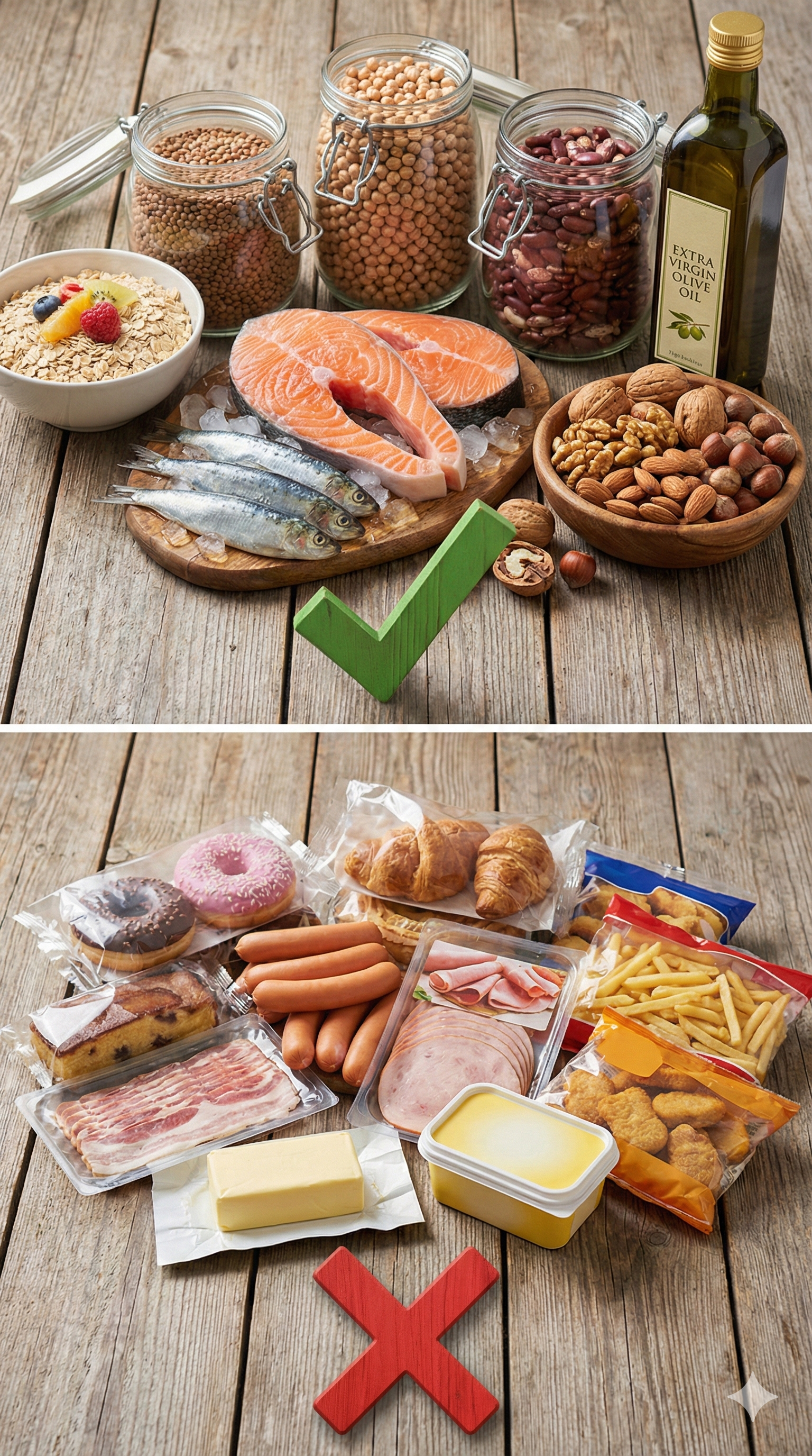Grasas trans y hidrogenadas, bollería industrial, embutidos y carnes procesadas, alimentos fritos, mantequilla y margarina.