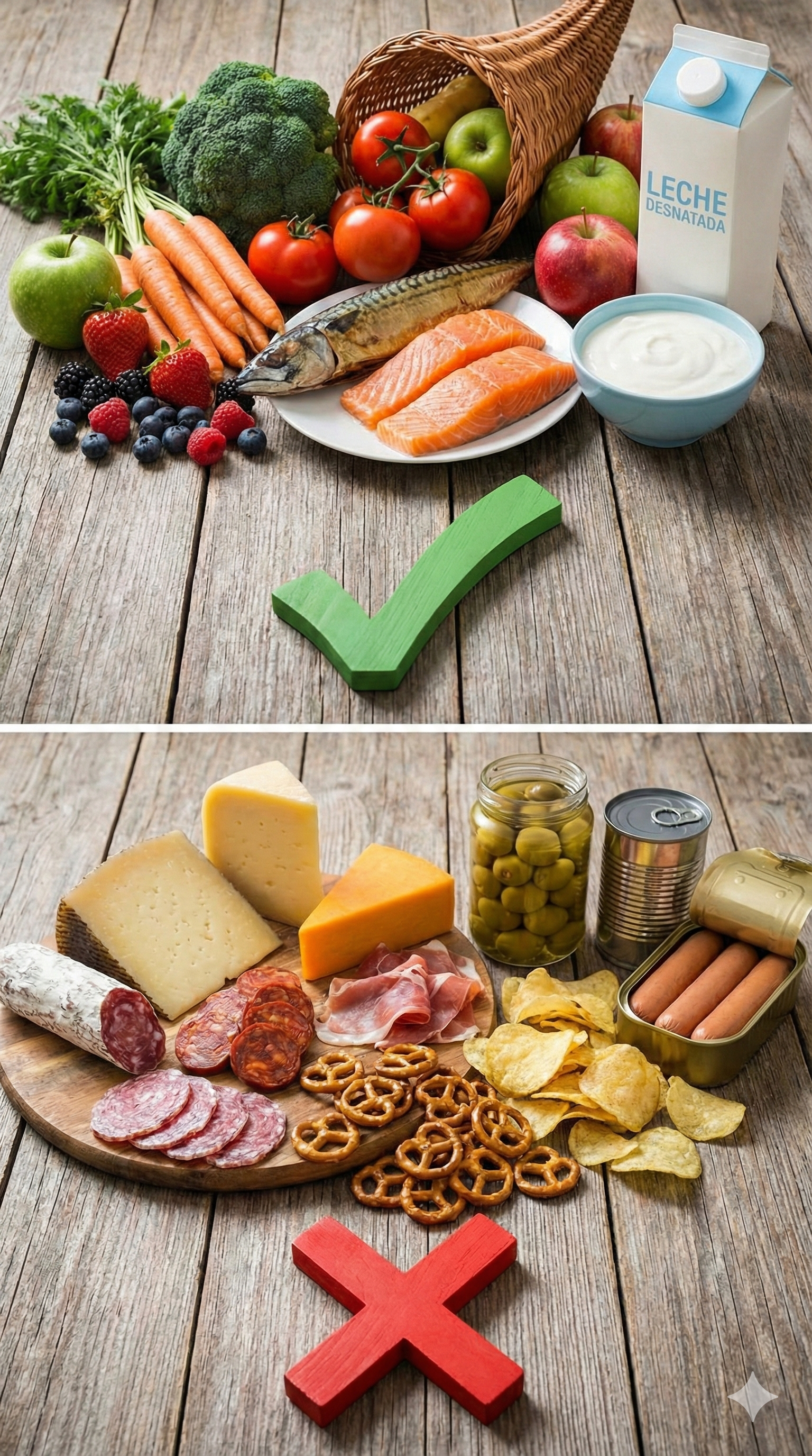 Embutidos y carnes procesadas, platos preparados y precocinados, snacks salados, conservas con alto contenido en sodio, bebidas alcohólicas.