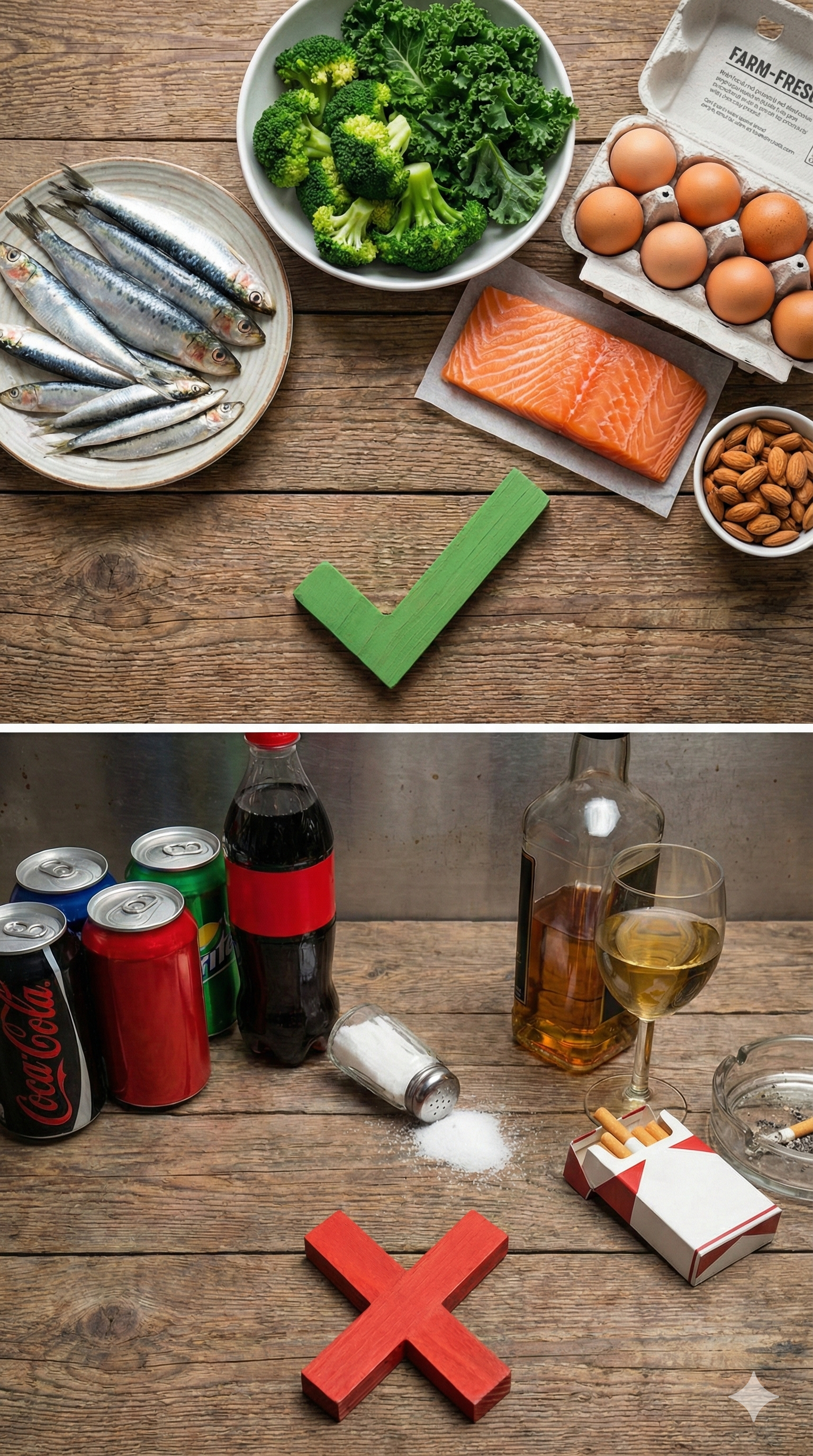 Bebidas alcohólicas en exceso, refrescos de cola, exceso de sal, dietas muy bajas en calorías, tabaco (aunque no es alimento, afecta a los huesos).